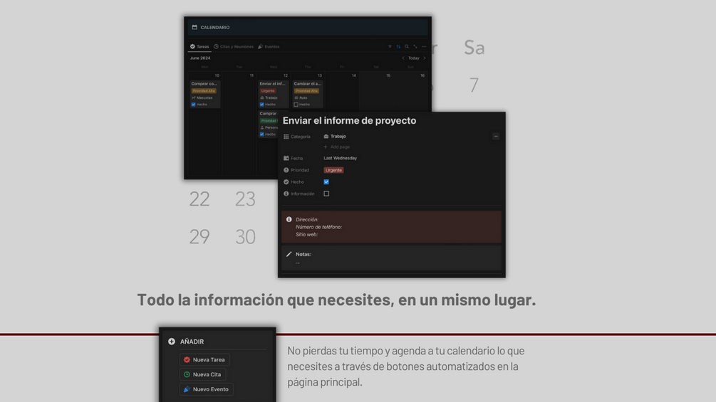 El Gestor de Tareas te permite organizar tanto tus tareas cotidianas, como tus pendientes en cada uno de los aspectos de tu día a día. Ya sea limpiar tu casa como un proyecto a entregar en tu trabajo o universidad, podrás incluirlo en un calendario intuitivo e integrado con Notion Calendar.